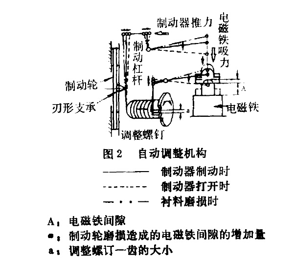 為了適應高速、頻繁作業(yè),高速型環(huán)鏈電動葫蘆采用雙重制動方式,即具有自動調(diào)整的主制動器和裝在電動機內(nèi)的輔助制動器。主制動器是電源切斷時動作的制動方式(圖1)。當與電動機同時給電磁鐵通電時,可動鐵心被吸引,制動面松開。制動時斷電,依靠彈簧力推壓制動輪產(chǎn)生制動力。由于制動器隨著制動次數(shù)和吸收能量而磨損,制動力逐漸減小,滑移增加,電磁鐵行程增加,因此需要定期調(diào)整。而這種制動器能自動進行調(diào)整,即制動輪的磨損所造成的電磁鐵的增加,可由調(diào)整杠桿跟蹤(或稱隨動)。如果行程過大,可使調(diào)整螺釘回轉(zhuǎn),恢復到原來的正常狀態(tài)(圖2)。萬一主制動器失效時,輔助制動器不會使載荷加速落下,而以等速下降。這是應用了一種離心式制動器,是在沒有異常下降就不動作的小型、省能式的安全制動器。