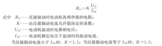 (1)反接制動(dòng)。反接制動(dòng)是利用改變電動(dòng)機(jī)電源的相序,使定子繞組產(chǎn)生相反方向的旋轉(zhuǎn)磁場(chǎng),產(chǎn)生的電磁轉(zhuǎn)矩是制動(dòng)轉(zhuǎn)矩,使電動(dòng)機(jī)轉(zhuǎn)速迅速下降,當(dāng)電動(dòng)機(jī)轉(zhuǎn)速接近于零時(shí).立即切斷三相交流電源,否則電動(dòng)機(jī)將反向起動(dòng)旋轉(zhuǎn)。電源反接制動(dòng)時(shí),轉(zhuǎn)子轉(zhuǎn)速與定子旋轉(zhuǎn)磁場(chǎng)的相對(duì)速度接近于2倍的電動(dòng)機(jī)同步轉(zhuǎn)速,以致反接制動(dòng)電流將為電動(dòng)機(jī)全壓起動(dòng)時(shí)起動(dòng)電流的2倍,于是產(chǎn)生過(guò)大的制動(dòng)轉(zhuǎn)矩,使電動(dòng)機(jī)繞組過(guò)分發(fā)熱。為此,電動(dòng)機(jī)電源反接制動(dòng)時(shí),應(yīng)在電動(dòng)機(jī)定子電路中串人反接制動(dòng)電阻,并限制其每小時(shí)反接制動(dòng)次數(shù)。反接制動(dòng)電阻接法有三相對(duì)稱接法與只有兩相接入的不對(duì)稱接法。當(dāng)采用三相對(duì)稱接法時(shí),其阻值可按下列經(jīng)驗(yàn)公式計(jì)算: