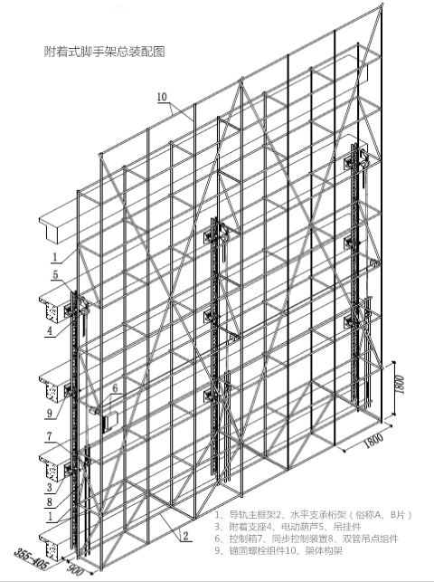 附著式腳手架主要由架體構(gòu)架、附著支承系統(tǒng)、升降系統(tǒng)、防墜系統(tǒng)、電氣控制系統(tǒng)、架體防護(hù)等六部分組成。