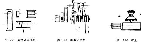 卷揚機俗稱絞車,它時刻由動力裝置驅(qū)動卷筒,通過撓性件如鋼絲繩、鏈條來起升或運移重物的起重裝置。常用的有卷繞式絞車,摩擦式絞車(圖1-2-9)和絞盤(圖1-2-10)。